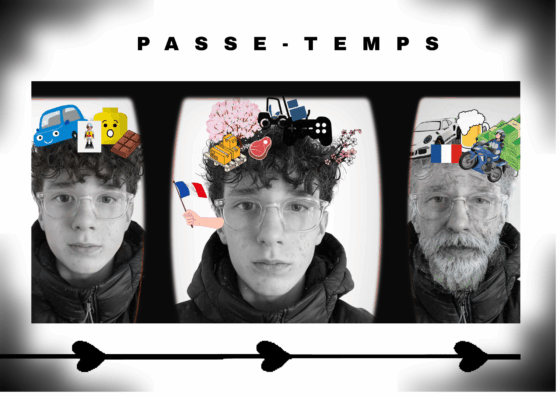 Les élèves de 1ère ont réalisé un triptyque surréaliste en trois temps : un autoportrait photo en noir et blanc, encadré par le portrait d’un proche enfant et adulte. Sur chaque tête, leurs passions et loisirs s’accumulent en collage coloré — foot, jeux vidéo, camions… tout ce qui les définit explose littéralement hors du cadre ! Un projet personnel et décalé, pile dans l’esprit surréaliste.