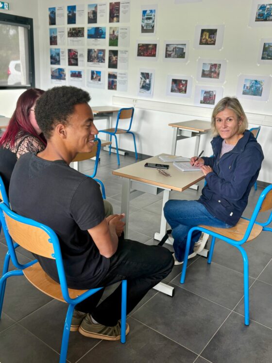 Ce vendredi, Océane et Taho, élèves en Terminale Bac Pro Conduite Routière, ont eu l’occasion de partager leur expérience à Anne Quéméner, journaliste du Télégramme. Au fil de l’échange, les lycéens ont parlé de leur passion commune pour la route, de leur quotidien en formation et de leurs projets pour l’avenir. Ils ont réussi à faire monter la professionnelle, à bord de la semi Saint-Gab’, pour un tour de piste !